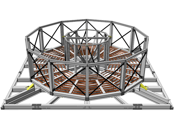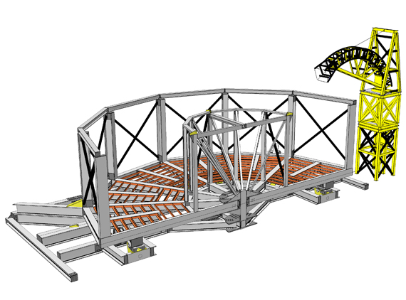 | 3D BluePrint was assigned to design and develop an unique cable carousel of 1250 tone capacity which can be delivered by road, rail or vessel anywhere in the world and suitable for self assembly. System is self contained and can be assembled on the quayside or the vessel. Basket Carousel system comprises basket, Spider frame base, Gooseneck tower and 20ft containerised HPU. The basket is rotated by electrically driven under-rollers. The basket can be raised or lowered via jacking cylinders on the spider frame under-rollers. More information Click here |